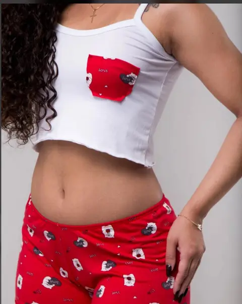 Detalhes: bolsinho no top e short com acabamento ondulado