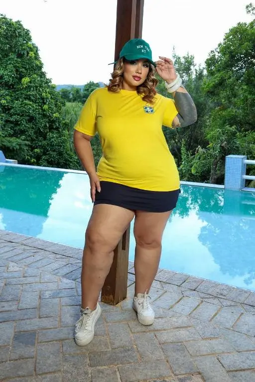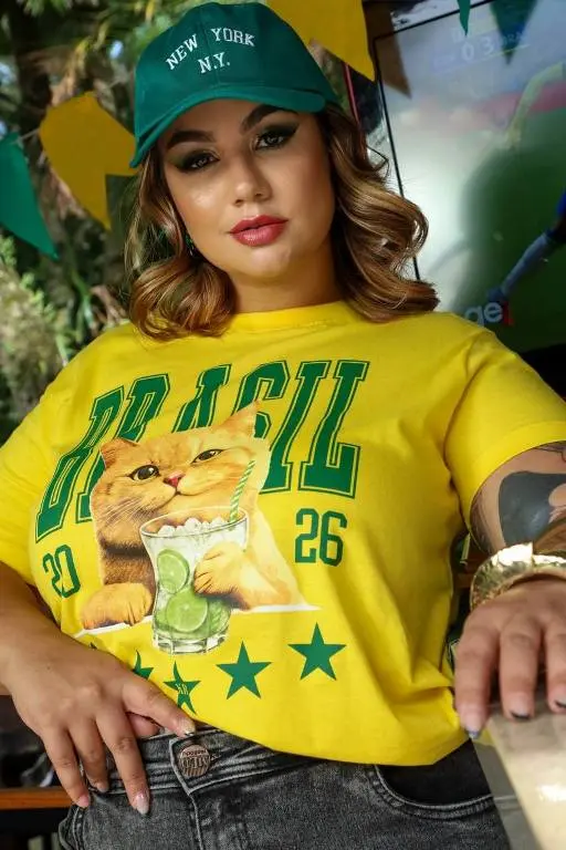 Corte Feminino: Modelagem Baby Look que se ajusta delicadamente ao corpo.