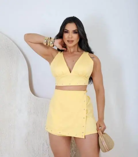 Saia Short: O charme da saia com a segurança do short interno. Apresenta corte assimétrico (transpassado) na frente, uma super tendência de moda.